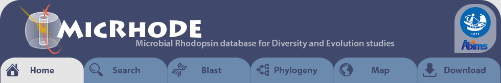 The aim of MicRhoDE is to provide the scientific community with a comprehensive, high-quality and freely accessible resource that facilitates analysis of the diversity and evolution of microbial rhodopsins, with an emphasis on proteorhodopsins. Proteorhodopsin is an abundant homolog of bacteriorhodopsin firstly discovered in a marine proteobacterium, known to be present in a wide diversity of microbes and in viruses. Proteorhodopsin-containing microorganisms are widespread in terrestrial, freshwater and marine photic environments.